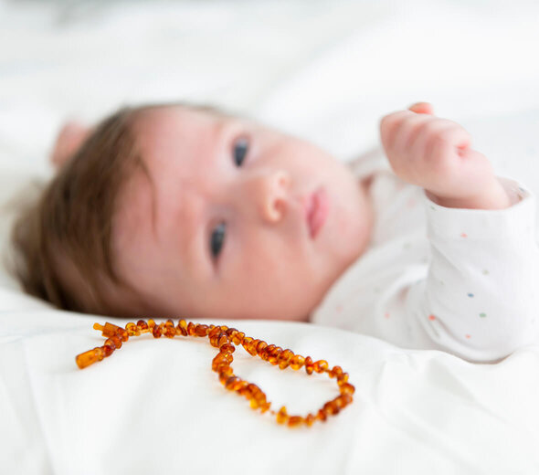 Bałtycki bursztyn doskonale uśmierza ból podczas ząbkowania. Założony bezpośrednio na skórę dziecka rozgrzewa się pod wpływem temperatury ciała i uwalnia kwas bursztynowy, którego działaniem jest łagodzenie bólu podczas ząbkowania.