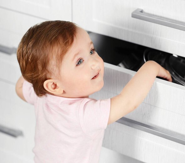 Aby żaden niebezpieczny przedmiot z mebli nie wylądował w rączkach maluszka, należy zabezpieczyć szafki specjalnymi zabezpieczeniami szafek i szuflad Canpol babies lub po prostu przełożyć wszystkie niebezpieczne przedmioty i szkodliwe środki czystości do szafek na górze, do których dziecko na pewno nie dosięgnie.