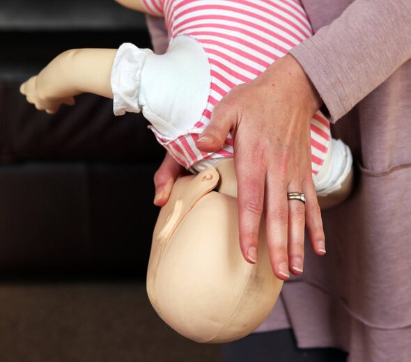 1. Pochyl maluszka do przodu lub przełóż je przez kolano i wykonaj 5 uderzeń w otwartą dłonią między łopatkami.