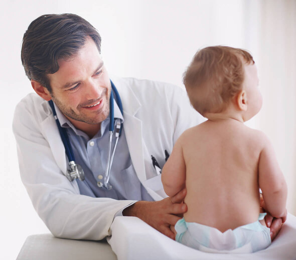 Uśmiechnięta kobieta trzyma na ręku niemowlę w białym body, w drugiej dłoni ma opakowanie z lekami. Naprzeciw stoi lekarka w kitlu, która udziela porady młodej matce.