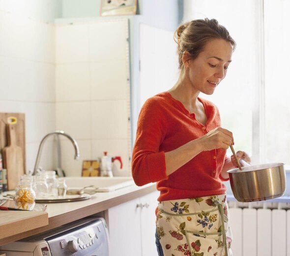 3. Przygotowując posiłki pamiętaj o tym, by mieć na sobie fartuszek, dzięki czemu zarazki znajdujące się na ubraniach nie będą miały kontaktu z przygotowywanym posiłkiem. W przypadku długich włosów – zwiąż je gumką.