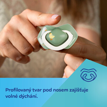 Výjimečně měkká silikonová sací část dudlíku vyžaduje méně úsilí při sání, což dítěti usnadňuje přijetí dudlíku. Špička je vyrobena ze 100% hypoalergenního a bezpečného silikonu, který je bez chuti a zápachu. Speciálně profilovaný štítek umožňuje dítěti volně dýchat nosem a minimalizuje otisky dudlíku na jemnou tvář dítěte. Další ventilační otvory umožňují pokožce dýchat a zabraňují podráždění pokožky. Pohodlná rukojeť dudlíku usnadňuje jeho podávání dítěti a umožňuje připevnit řetízek nebo stuhu na dudlík, který bude dudlík chránit před ztrátou, pádem na zem a ušpiněním.