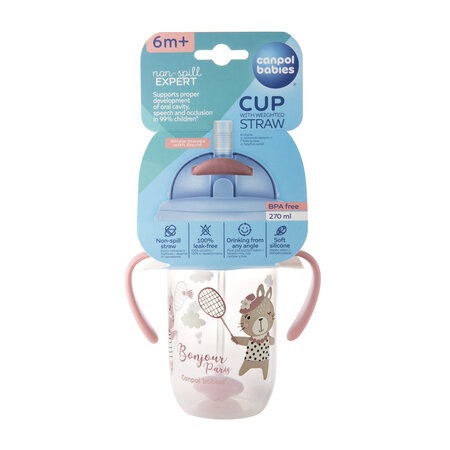Canpol babies nevylévací hrneček se slámkou a závažím 270ml BONJOUR PARIS růžový