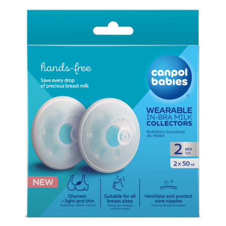 Sběrač mateřského mléka do podprsenky Canpol babies nemusíte držet v ruce. Je lehký a tenký – po vložení do podprsenky je diskrétní a pohodlný při nošení. Nezatěžuje prsa při sběru mléka. Po přitlačení k prsu se sběrač samovolně nasaje a funguje jako manuální odsávačka mléka. Sběrné trychtýře jsou vyrobeny z plastu, který neobsahuje BPA ani jiné škodlivé látky – jsou bezpečné a vhodné pro přímý kontakt s mateřským mlékem.