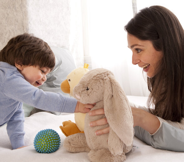 Inną prostą zabawą ruchową, którą lubiło moje dziecko, jest turlanie. Na początku możesz spróbować turlać malucha na swoich nogach, potem na podłodze (na dywanie). Na początku pomagaj mu, a potem coraz bardziej staraj się, by samodzielnie próbowało przewracać się raz na brzuszek, raz na plecy. Ja często łączyłam turlanie ze zwijaniem córki w kocyk jak naleśnik. Jak to zrobić? Dziecko turlaj zawijając w kocyk tak, aby wystawała tylko jego głowa i rączki. Przytul je wtedy i pocałuj, by czuło się bezpiecznie. Następne turlanie to rozwijanie się z kocyka. To ćwiczenie kształtuje świadomość przestrzeni, ale przede wszystkim jest świetną zabawą.