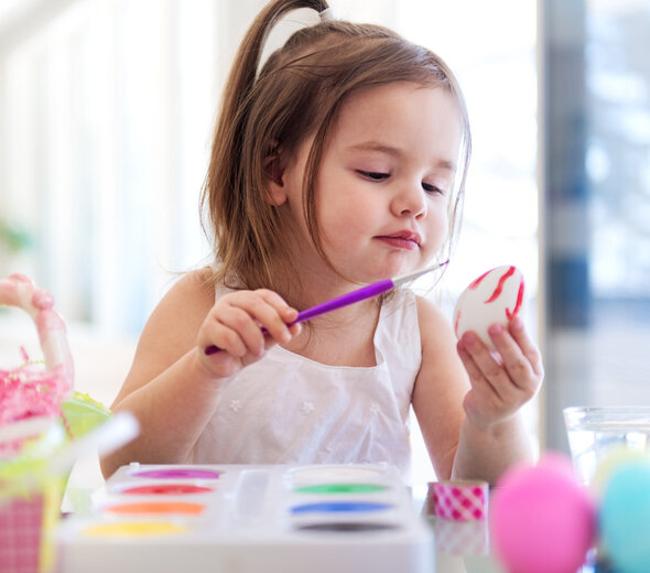Przygotuj na folii wystudzone jajka i farby paluszkowe (farby dla najmłodszych, którymi można malować bez pomocy pędzelka, wystarczą rączki). Jeśli maluch po raz pierwszy maluje palcami, przed przystąpieniem do malowania jajek, daj mu poeksperymentować na papierze. Przeczytaj o tym, co możesz zrobić z maluchem, by oswoić nową zabawkę (farby) w poradzie jednej z mam Canpoluhttp://canpolbabies.com/pl/porady/porada/mothers/18/8-zabawy-dla-dzieci-12-18-miesiecy--chodz-pomaluj-moj-swiat.