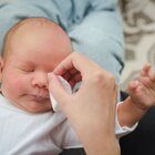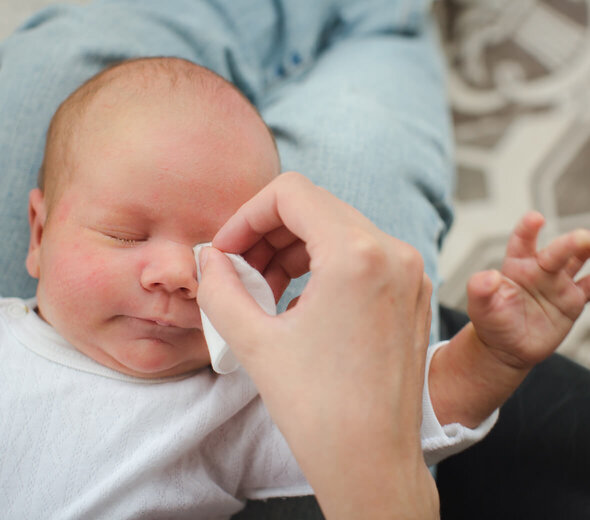 Nie wycieraj maluchowi oczu na sucho. W ten sposób możesz jedynie podrażnić już i tak wrażliwe oczka dziecka.