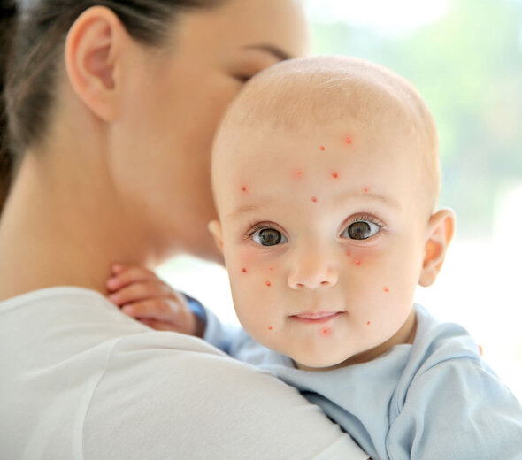 Są to malutkie krostki i pryszcze o zabarwieniu czerwonym. Trądzik noworodków pojawia się zazwyczaj od dwóch do czterech tygodni po porodzie i po kilku dniach samoistnie znika. W przypadku noworodków, które są karmione piersią objawia się on znacznie silniej, dlatego iż wraz z mlekiem matki przyjmowane są hormony.Leczenie: brak.