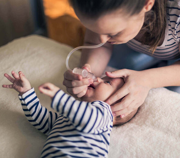 Niemowlę nie potrafi samodzielnie wydmuchać zatkanego nosa, dlatego musisz go regularnie udrażniać za pomocą aspiratora np. Canpol babies z miękką, silikonową końcówką, która jest przystosowana do kształtu małego noska. Przed oczyszczaniem zaaplikuj do każdej dziurki sól fizjologiczną lub wodę morską, które rozpuszczą zaschniętą wydzielinę i ułatwią jej usunięcie.