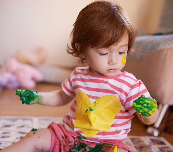 Malowanie rączkami to chyba ulubiona zabawa dzieci. Niestety wiąże się z bałaganem, dlatego warto się do niej odpowiednio przygotować. Przed zabawą zabezpiecz dobrze podłogę, dzięki temu może się okazać, że nie będziesz miała za wiele do sprzątania. Świetnie sprawdzi się do tego folia malarska, którą znajdziesz w każdym sklepie z artykułami budowlanymi. Przyklej ją taśmą w miejscu, w którym planujesz zabawę z malowaniem. Dzięki temu będziesz miała pewność, że się nie przesunie, gdy dzieci będą tworzyć swoje arcydzieła.