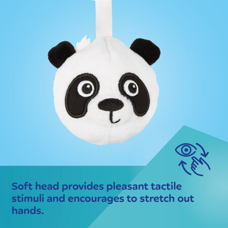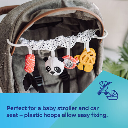 Symbol: 68/085Sensory hanging toy for baby stroller is a great idea for the first toy for babies that will make every walk and travel more pleasant. Perfect for baby stroller and car seat – the hanging toy can be fastened by using safe and convenient plastic rings at both ends. The toys attached to the hanging toy, help to develop motor skills (grasping, pulling, shaking), activate the sense of hearing (rustling elements, rattles), sight (contrasting colors, mirror) and touch (various textures). Subtle, but contrasting colors will encourage the child to grasp and play. Each element of the hanging toy has a different function – a bell with a bow makes delicate sounds, a soft plush panda, made of a pleasant to the touch and soft material, retains its shape when squeezed, a mirror surrounded by colorful tags with a rattle and two leaves – one pleasantly rustles and the other in the form of a teether will bring relief during teething.