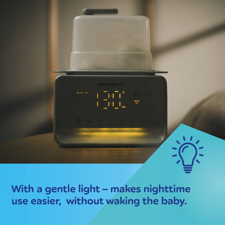 Symbol: 12/218The Canpol babies 7in1 Bottle Warmer and Steriliser with Thermostat & Lamp is a multifunctional device that makes preparing food for your baby quick and easy. It features 7 different modes: milk heating, jar heating, fast heating (in 2-3 minutes), defrosting, sterilisation, temperature maintenance, and a night light function.