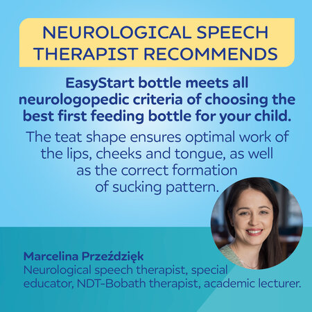 “EasyStart bottle meets all neurologopedic criteria for choosing the best first feeding bottle for your baby. The shape of the teat ensures optimal functioning of the lips, cheeks and tongue, also proper formation of the sucking pattern."