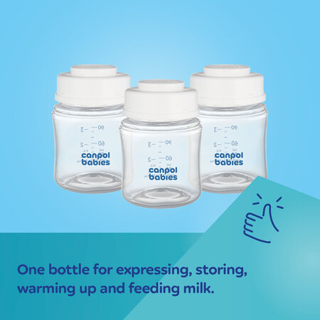 Symbol: 35/235Mother's milk is a valuable and best food for a baby from the first days of life. We also know what challenges and difficulties a mother has to face during breastfeeding, that's why Canpol babies bottle set for breast milk storage was created to use breast milk in the spirit of "zero waste" – till the last drop. Canpol babies bottle set for breast milk storage can be used directly with breast pumps, allowing you to express, store, warm and feed your baby with breast milk using the same bottle. Thanks to this, not a drop of valuable food will be wasted. As a result, no need to pour the expressed milk into special bags makes it more economical and less washing up. The bottles can be washed in a dishwasher and disinfected in a sterilizer and heated in a microwave or bottle warmer. The bottles are made of the material that allows the preservation of the beneficial properties of breast milk and its safe storage in the fridge or freezer for up to 6 months. Clear and precise scale makes it easy to control the amount of expressed milk. The set also includes caps and nuts for tight closure. The bottle can be used with all Canpol babies feeding teats. Canpol babies bottle set for breast milk storage is a great help when breastfeeding. It was created for safe and long-term storage of expressed milk, so as to provide mums with comfort in situations when they have to leave the house and leave the child in the care of another person or when there is a temporary shortage of milk.