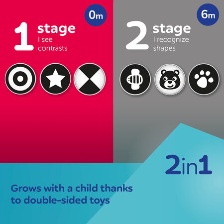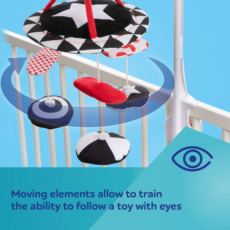 Stimulates the eyesight - with red and black - the first colors that newborns see.