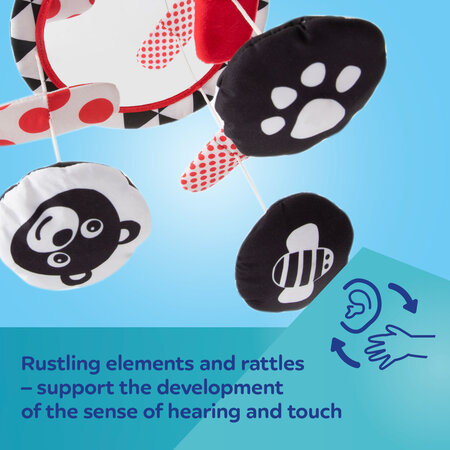 Symbol: 68/083The contrast musical mobile from the SENSORY TOYS collection has interactive elements that will occupy your child for a long time. It supports the development of the toddler from the first days. It stimulates the eyesight, thanks to red and black - the first colors that newborns see. The toy positively affects the development of visual, auditory and motor coordination of the child. It has a bell, rustling elements and rattles. Two mirrors are an additionall attraction - every child likes to look around and observe the world. The musical mobile will be perfect for walks and travels, thanks to a convenient clip that will allow you to mount it to a seat, stroller, crib, and also as an additional element to the Canpol babies sensory mat.