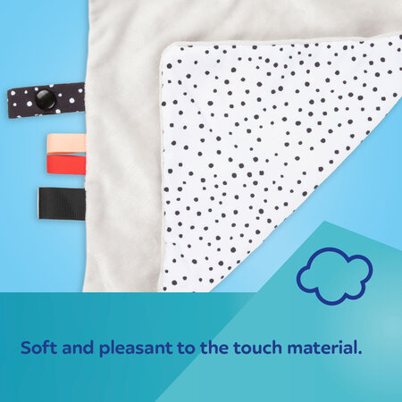 Symbol: 68/087Irreplaceable friend for every child at home and on the go, who will calm, help the baby to fall asleep and take care of its soother. The material is exceptionally nice and pleasant to the touch and when soaked with the parent's scent, it will cuddle the baby to sleep during every nap and make the baby feel safe, wherever it is. Canpol babies cuddle toy-blanket has a ribbon with a snap to which you can attach a soother. Canpol babies cuddle toy-blanket fits perfectly to small baby's hands, which will be able to knead and mince it, exploring the world with one of the most important human senses, supporting the child's grasping and sensory development.