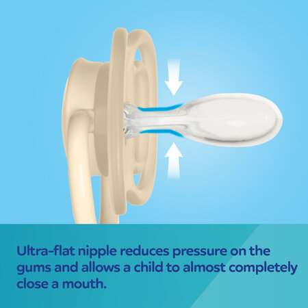 Ultra-flat nipple reduces pressure on the gums and allows a child to almost completely close a mouth.