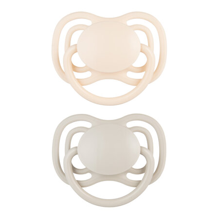 The nipple is made of the highest quality, safe and gentle silicone. It is odorless and tasteless. The shield provides maximum air flow, which ensures free breathing, preventing irritation and minimizes the risk of the soother getting marked on the child's delicate face. The specially designed shape of the shield also makes it easier to breathe freely and swallow. The soother is safe and easy to keep clean – a case that can be used for storage, but also for quick and convenient sterilisation in the microwave. Just a little water and 2 minutes are enough to ensure hygienic cleanliness of the soothers. The soothers are durable and resistant to deformation. No BPA or other harmful substances were used in production. These soothers are recommended for children aged 6-18 months. The pacifier in fashionable pastel colors is available in various sizes – it grows with your baby.