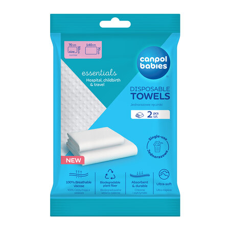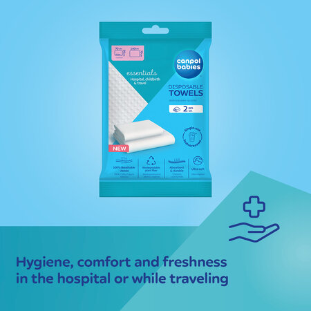 Absorbent and durable disposable towels Canpol babies made from 100% breathable viscose. Gentle and ultra-soft, crafted from a soft, airy material. They provide hygiene, comfort, and freshness in unusual situations such as travel or hospital stays. Disposable towels are an essential item in a hospital bag, especially after childbirth. The moisture-absorbing, durable plant-based fiber they are made from is biodegradable and environmentally friendly.