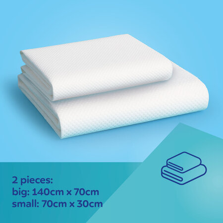 The package contains two disposable towels in sizes 70 × 30 cm and 140 × 70 cm. The towels are made of 100% breathable viscose, ensuring comfort and softness during use.