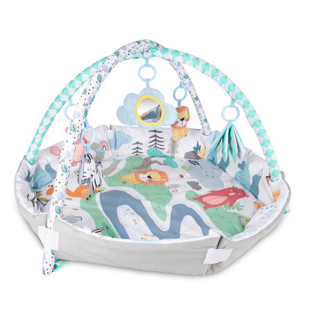 Symbol: 81/100Educational play mat SAFARI is a 3-in-1 solution that grows with the child and can be used as a playpen, educational mat with toys on arches or simply like a mat without additional accessories. So many possibilities make the mat encourage the child to play for a long time.