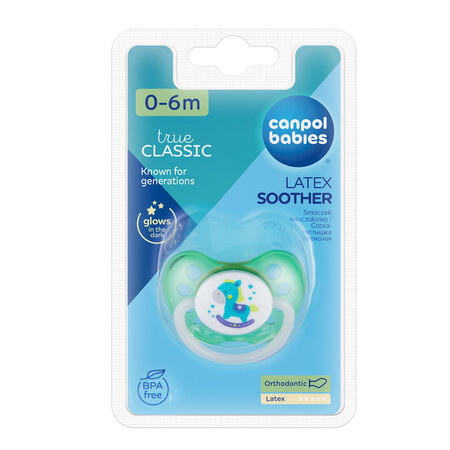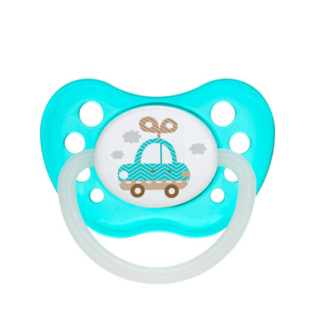 Symbol: 23/259Soother TOYS made of high quality latex. Equipped with orthodontic nipple. Thanks to the holes in the shield, the soother does not irritate baby's sensitive mouth.H as a glowing in the dark handle which helps find the soother at night. BPA Free. Available in several colors. Designed for children aged 0-6 months.