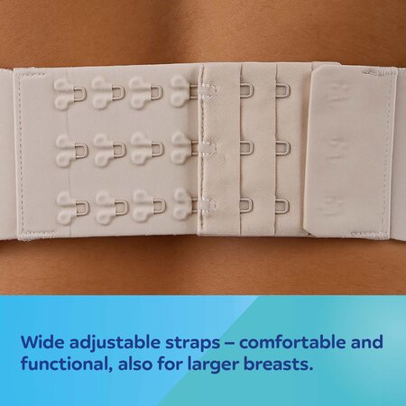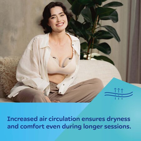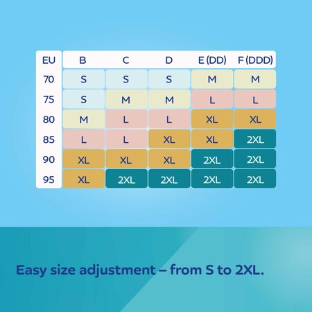 A breathable, quick-drying bra designed for women throughout pregnancy and breastfeeding. Ultra-soft, wire-free and pressure-free. Comfortable and discreet thanks to detachable straps and easy one-handed cup release. Provides full 360° support and lift, flexible fit, and all-day freedom of movement. Integrated shaping pads stay in place during washing and wear. The bra holds a breast pump securely and supports efficient expressing. Feels like a second skin—lightweight and comfortable even during sleep and night feeds. Enhanced airflow keeps you dry and comfortable, even during longer pumping sessions. The durable fabric retains its shape and quality even after multiple washes. Features wide, adjustable straps for comfort and functionality, also for larger busts. Comes with an extension piece and an adjustable hook-and-eye closure, ensuring a tailored fit for every band and cup size – add one cup size to the standard bra size you wore before pregnancy. The bra should fit well and comfortably on the tightest hook setting, while still allowing room for adjustment as your bust grows.