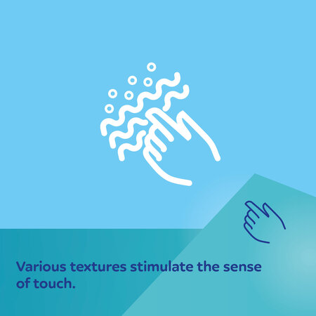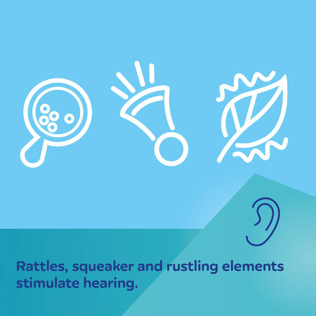 Rattles, squeaker and rustling elements stimulate the sense of hearing.