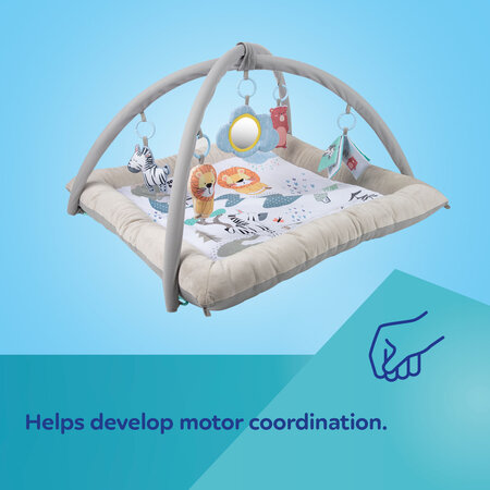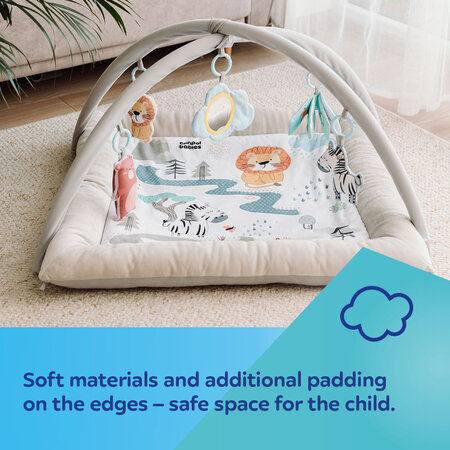 Symbol: 81/101Plush educational mat with arches for children 0+ SAFARI is a combination of the safe space to play with toys that encourage the child to be active and reach out to them. Different textures of materials, contrasting colors and soft sounds are great entertainment for the developing senses of the baby from the first moments of life. Additional filling on the edges of the mat creates a safe space for the child to play and it will allow parents to have a moment for themselves or household chores. A zebra, a lion and a bear, a book and a mirror are friendly pendants encourage the child to be active and reach out to them, helping to develop motor skills, strengthen muscles and practice manual skills, as well as supporting the development of the senses through play – sight, hearing and touch.