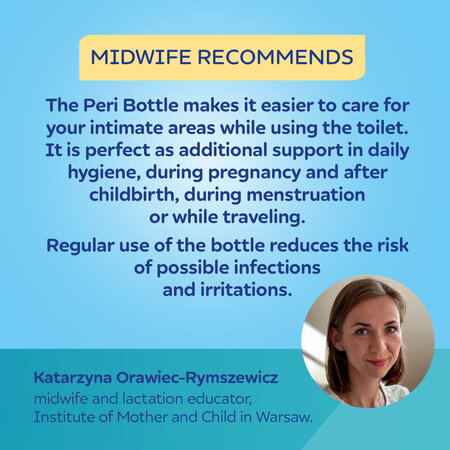Symbol: 1/659The Peri Bottle for washing of intimate areas facilitates perineal care when using the toilet and replaces the traditional bidet in many situations. It is great as an extra support for daily hygiene, during pregnancy and after birth, during menstruation or when travelling. Canpol babies Postpartum Peri Bottle for washing of intimate areas is recommended by a midwife from the Institute of Mother and Child in Warsaw.* Regular use of the bottle reduces the risk of possible infections or additional irritation.