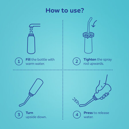 The Peri Bottle is designed to make intimate hygiene quick and easy wherever you are: in hospital, at home or on the go. The bottle's long 17 cm neck and two tips with different water stream angles allow for better customisation. When squeezed, the inverted bottle releases the water stream at the expected angle, making it easier to reach hard-to-reach areas. Makes it easier to get underneath without having to bend over or during pregnancy when a pregnant woman's belly makes it difficult to perform hygiene activities.