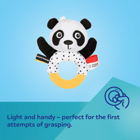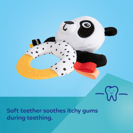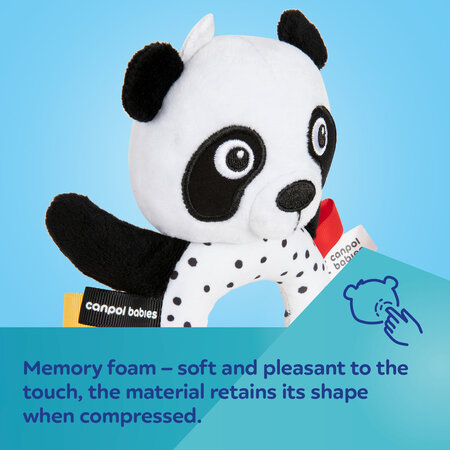Symbol: 68/086Cute Canpol babies BabiesBoo sensory teether with a rattle is perfect first companion for grip training, which will encourage every baby to play. The toy is light and comfortable for grasping and holding in small child's hands. When shaken, it makes delicate, pleasant sounds. Soft yellow teether with nubs massages the gums, relieving itching from erupting teeth. Pleasant to the touch material and friendly face of the panda with contrasting colors attract the child's attention, stimulating the senses and supporting their development – sight, hearing and touch. Sewn-in colorful tags and grains in the paws additionally stimulate the child's sensory. Canpol babies BabiesBoo sensory teether with a rattle develops fine motor skills (grasping and shaking), activates the sense of hearing, sight and touch, and as a teether – it brings relief during the difficult time of teething. Canpol babies sensory teether with a rattle is an excellent choice for the youngest babies.
