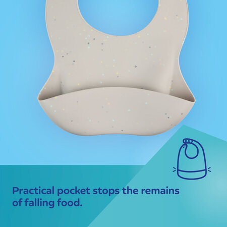 Symbol: 51/029_greyWaterproof silicone bib with a pocket is essential when expanding your baby's diet and for the first independent meals. Protects your child's clothes from getting dirty and wet while eating perfectly. It is light, soft, flexible and pleasant to the touch. The bib is made of 100% high quality food-grade silicone, making it safe and odorless. Practical deep pocket retains food remains that did not end up in the child's mouth. The pocket is designed so that when filled with food, it retains its shape and the child does not empty it by accident when moving or pressing on it. The bib is easy to clean – you can rinse it under running water, wipe it or wash it in the dishwasher.