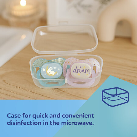 The soother is durable, deformation-resistant, and easy to keep clean. The modern sterilization case allows quick and hygienic sterilization in the microwave – just add a little water and heat for 2 minutes to ensure perfect cleanliness.