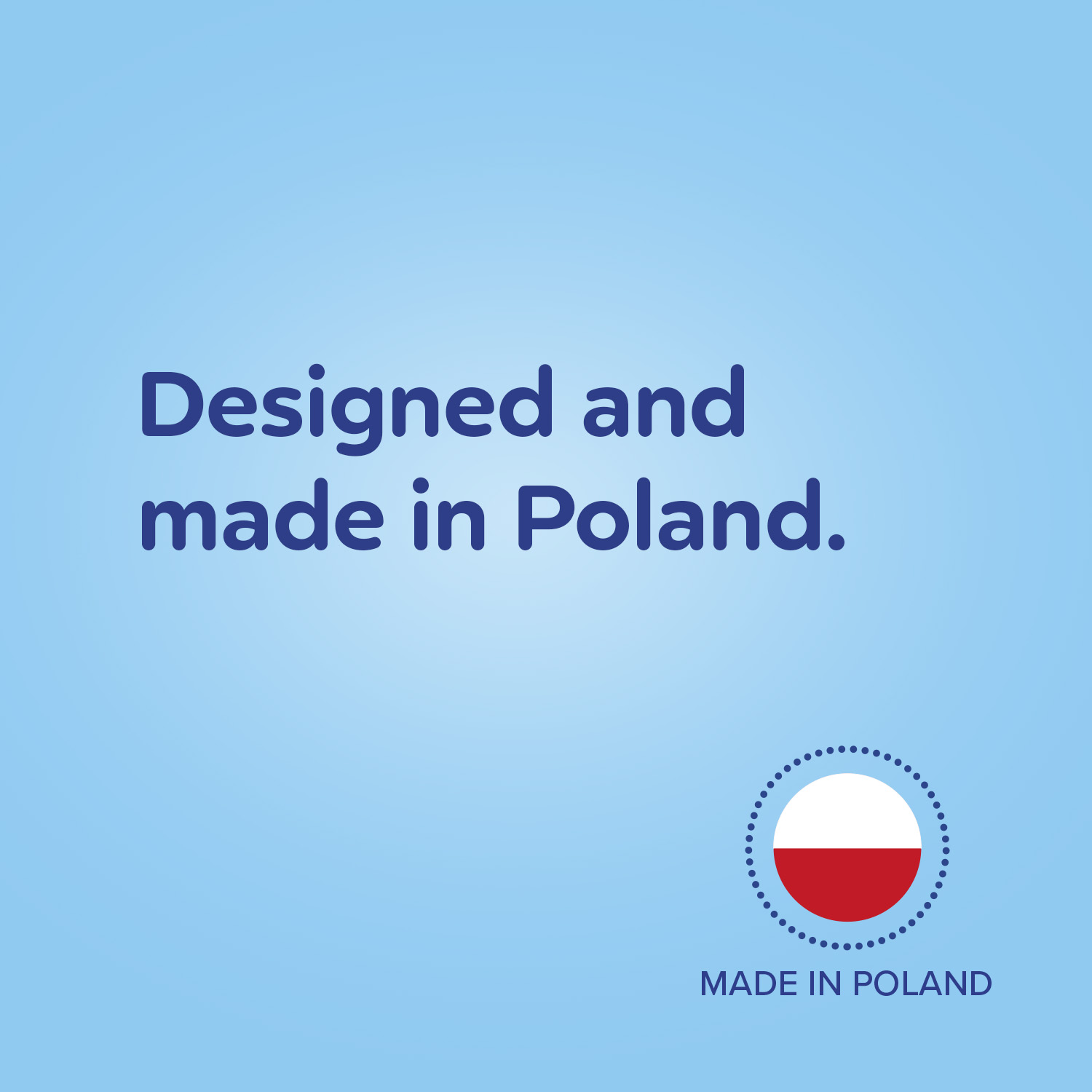 Designed and manufactured in Poland, BPA-free and available in two color versions (pink and blue) and three age stages: 0–6m, 6–18m, and 18m+.