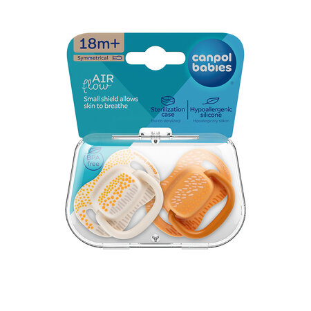 Symbol: 34/932_yelSoother is an inseparable friend of every baby, which will bring comfort and calm the need to suck. Symmetrical soother adapts well to the baby's mouth regardless of how it is placed, and its shape is considered the most physiological and supports the maintenance of the natural sucking rhythm and proper speech development. The nipple is made of the highest quality, safe and delicate silicone. It is odorless and tasteless, which makes it easier for the baby to accept the soother. Specially profiled shield allows the baby to breathe freely through the nose and minimizes the imprinting of the sootehr on the baby's delicate face. Additional vented openings allow the skin to breathe and prevent irritation. Convenient handle of the soother makes it easier to give it to the child and allows to attach a soother chain or ribbon that will protect the soother from being lost or falling to the ground and getting dirty. Canpol babies symmetrical silicone soother 18m+ Mountains is durable and resistant to deformation. The soother is safe and easy to keep clean, thanks to the modern case that can be used both for storage and for quick and convenient sterilization in a microwave oven. Just a little bit of water and 2 minutes are enough to keep the soothers hygienically clean. No BPA or other harmful substances were used in production. Canpol babies symmetrical silicone soother is recommended for children over 18 months. Canpol babies symmetrical soother 18m+ Mountains is available in two colors and different sizes – it grows with your baby.