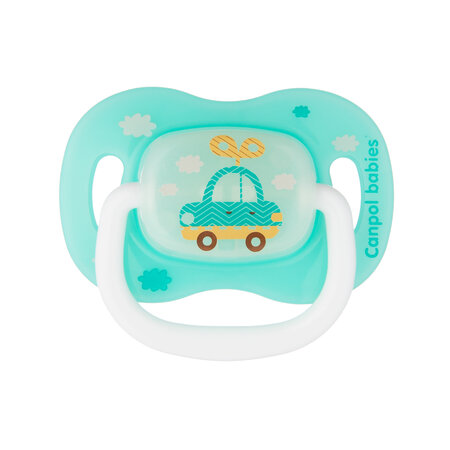 Symbol: 23/293TOYS soother will relax and calm your baby. Ortodontic shaped nipple is made of the highest quality, safe and gentle silicone, odorless and tasteless, which makes it easier for the baby to accept the soother. Ventilated holes in the shield ensure free breathing and swallowing of saliva. Specially designed shape of the shield minimizes the imprinting of the soother on the baby's delicate face, preventing irritation. Convenient soother holder allows you to attach the soother holder and makes it easier to give it to the baby. Glowing in the dark shield makes it easy to find the soother at night. Canpol babies ortodontic soother TOYS is durable and resistant to deformation. BPA-free. Canpol babies ortodontic silicone soother TOYS is safe and easy to keep clean - it can be disinfected in boiling water and in the sterilizer. Symmetrical soother adapts to the child's mouth well regardless of the way it is placed, and its shape is considered the most physiological and supports the maintenance of the natural sucking rhythm and proper speech development. Canpol babies ortodontic silicone soother TOYS is available in several unique designs and different sizes - it grows with the baby.