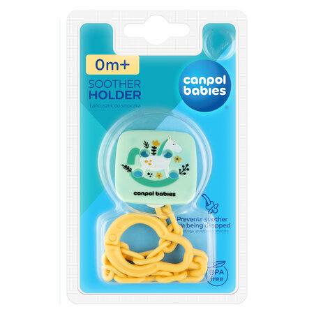Symbol: 2/438_greThe Canpol babies soother holder from the Toys collection will effectively protect your baby's favorite pacifier against falling, getting dirty or lost. A solid clip allows you to attach the soother holder to a child's clothes, and thanks to its simple design, it can be easily attached with one hand. The product is safe and durable, and rounded edges eliminate the risk of scratches or cuts. Additionally, the Canpol soother holder is gentle on clothes – it holds well, leaves no marks and does not damage the material.