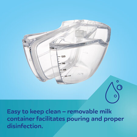 Easy to keep clean – open milk container makes it easier to pour, disinfect and dry it inside.