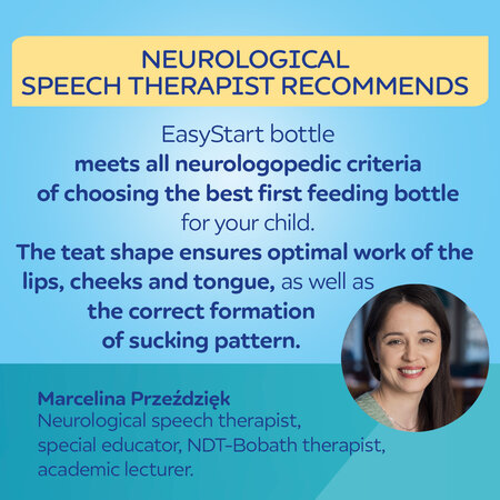 “EasyStart bottle meets all neurologopedic criteria for choosing the best first feeding bottle for your child. The shape of the teat allows for optimal functioning of the lips, cheeks and tongue, as well as the correct formation of the suckling pattern.