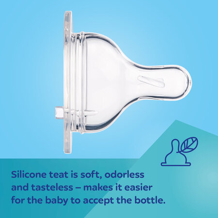 Silicone teat is soft, odorless and tasteless – it makes it easier for the baby to accept the bottle.