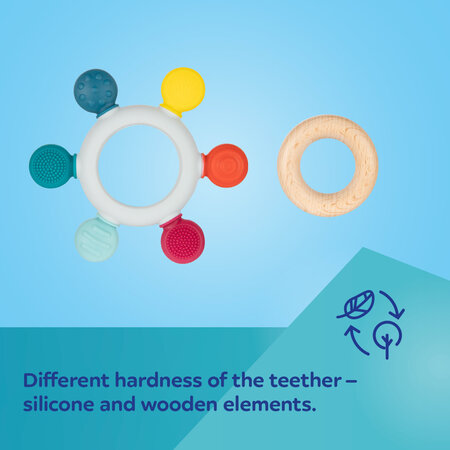 Symbol: 80/306Wooden-silicone teether is the perfect first toy for babies and irreplaceable support during the difficult time of teething for the youngest babies. The teether combines natural beech wood and safe silicone in a stylish way. Thanks to the diverse structure and hardness of the materials, it is perfect when the baby's gums are very itchy and the child has a strong need to bite. Light, handy and cheerful shape will make it easy to grasp and encourage the child to play. Canpol babies wooden-silicone teether CRAB will support the development of new skills, such as learning to grasp, manipulation of the objects or hand-eye coordination. Light and handy Canpol babies wooden-silicone teether CRAB will bring relief to itchy gums, and interesting shape will make the baby not want to let it out of its hands. Canpol babies wooden-silicone teether for babies CRAB is made of safe silicone and natural beech wood, which thanks to careful processing is smooth and delicate to the touch. Canpol wooden-silicone teether for babies CRAB is exceptionally durable – resistant to falls and impacts.