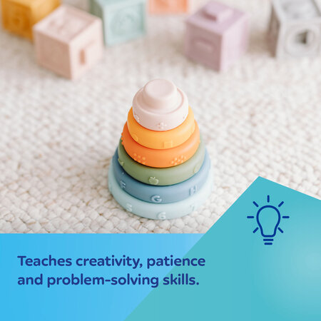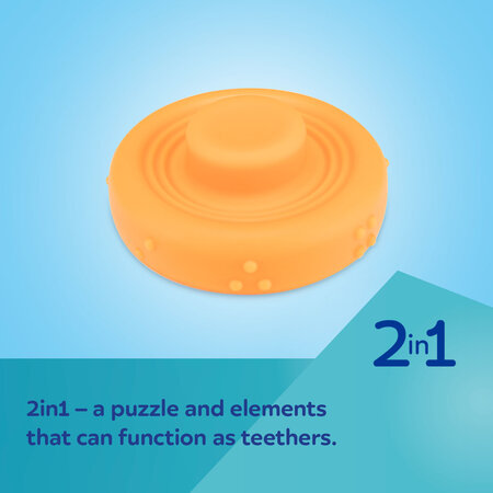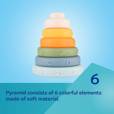 Symbol: 79/103Canpol babies sensory ring puzzle pyramid consists of 6 elements in various sizes and colors. Stacking of the colorful elements from the largest to the smallest in a pyramid shape exercises the child's dexterity and patience. Canpol babies sensory ring puzzle pyramid helps in learning to distinguish colors and sizes, supports eye-hand coordination of the child. Each layer of the pyramid has insets of various shapes – numbers, letters, dots, etc., so that the baby can touch them with his fingers, learning new textures, activating the sense of touch or "tasting" – some elements will be great as teethers. Canpol babies sensory ring puzzle pyramid is a classic educational toy thanks to which the child, through play, exercises manual skills, memory and imagination as well as logical and strategic thinking – how to make a tower out of scattered elements. Arranging of the pyramid is a great addictive fun for little ones. Canpol babies sensory ring puzzle pyramid is recommended for children from 8 months of age.