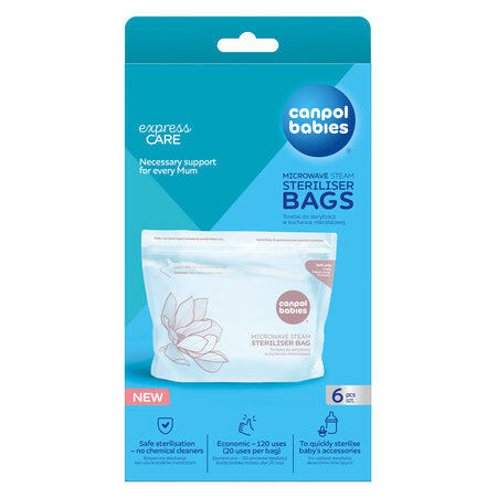 Szimbólum: 70/002A Canpol babies mikrohullámú sterilizáló zacskók egyszerű, gyors és biztonságos módot nyújtanak a cumisüvegek, cumik, mellszívó alkatrészek és egyéb baba- és gyerektermékek sterilizálására. Ez a sterilizálás biztonságos, vegyszermentes, és mindössze 90 másodpercet vesz igénybe. A sterilizálás során a zacskóban keletkező vízgőz eltávolítja a baktériumokat és kórokozókat, így biztosítva a higiénikus tisztaságot. Minden zacskó akár 20 alkalommal is használható, így egy csomag termék összesen 120 sterilizálásra elég. A termék remek helyettesítője a hagyományos sterilizálónak, amikor úton van, és nem tudja magával vinni a készüléket, vagy ha otthon kevés a tárolóhely. Biztonságos, BPA-mentes és egyéb káros anyagoktól mentes műanyagból készültek.