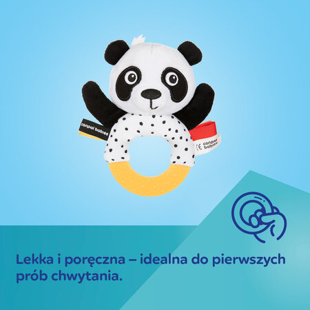Szimbólum: 68/086Az aranyos Canpol Babies BabiesBoo csörgő fejlesztőjáték rágóka minden babát játékra ösztönöz, és tökéletes első társ a markolás gyakorlására. A játék könnyen és kényelmesen tartható a kisgyermek kezében is. Megrázva lágy, kellemes hangokat ad ki. A puha, sárga, csomókkal ellátott rágóka masszírozza az ínyt, enyhíti a kinövő fogak okozta viszketést. A kellemes tapintású anyag és a panda barátságos arca kontrasztos színekkel vonzza a gyermek figyelmét, serkenti az érzékszerveket és segíti fejlődésüket – a látást, hallást és tapintást. A bevarrt színes címkék és a mancsokban lévő szemcsék stimulálják a gyermek érzékszerveit. A Canpol babies BabiesBoo csörgő fejlesztőjáték rágókával fejleszti a finommotorikus készségeket (fogás és rázás), aktiválja a hallás, a látás és a tapintás érzékét, és rágókaként - megnyugvást hoz a fogzás nehéz időszakában. A Canpol babies csörgő fejlesztőjáték rágókával kiváló választás a legkisebb babák számára.