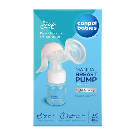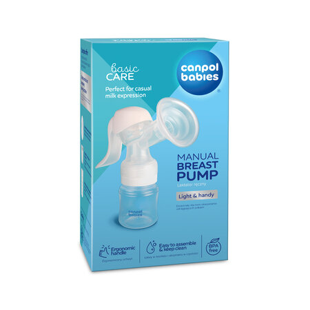A Basic kézi mellszívó a mellékelt adapternek köszönhetően minden Canpol babies anti-kólikás és standard cumisüveghez illik. A készlet a következőket tartalmazza: egy mellszívótest pumpáló fogantyúval, egy szilikon szelep, egy cumisüveg és egy cumisüveg-adapter.