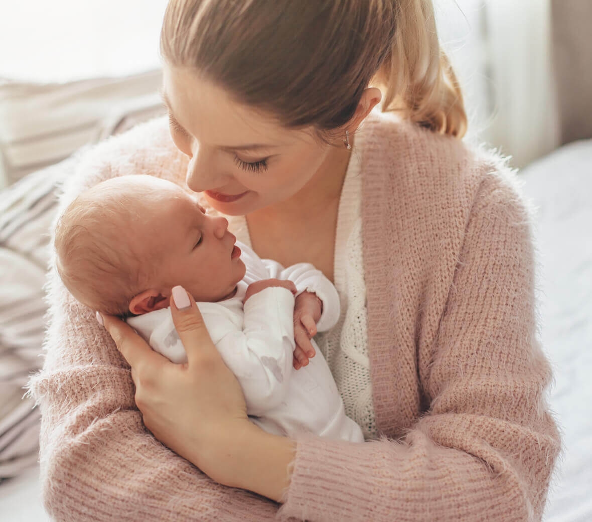 Pierwszy kontakt „skóra do skóry” daje wiele korzyści, zarówno Tobie, jak i dziecku. Maluszek kolonizuje się florą bakteryjną mamy, co wpływa pozytywnie na jego odporność. Bliski kontakt sprzyja również karmieniu piersią, ponieważ zapach mamy może pobudzić u maluszka odruch ssania. Poza tym wczesne przystawienie do piersi, zwiększa szanse na długie karmienie.