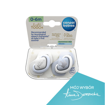 Simbol: 22/650_bluCanpol babies Suzetă simetrică din silicon Light touch 0-6 luni ROYAL BABY 2 buc.