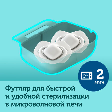Современный контейнер для быстрой и удобной стерилизации в микроволновой печи - 2 минуты и немного воды достаточно, чтобы пустышки оставались гигиенически чистыми.